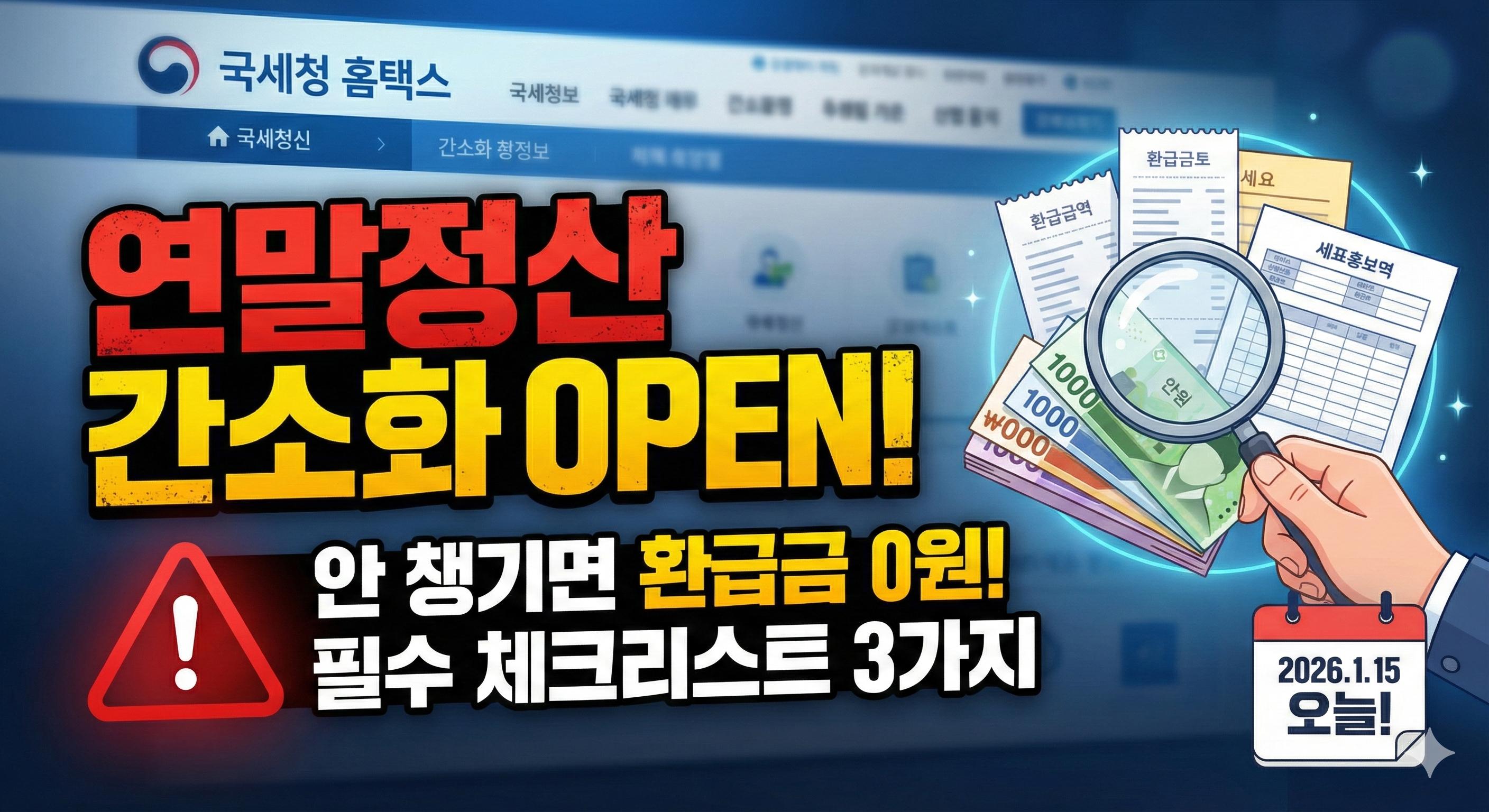 2026년 1월 15일 오늘, 국세청 홈택스 연말정산 간소화 서비스가 개통되었습니다. 많은 직장인들이 간소화 자료를 '조회'하고 '내려받기' 하면 끝난다고 생각합니다. 하지만 이는 세금을 돌려받을 기회를 스스로 차버리는 행동이 될 수 있습니다.