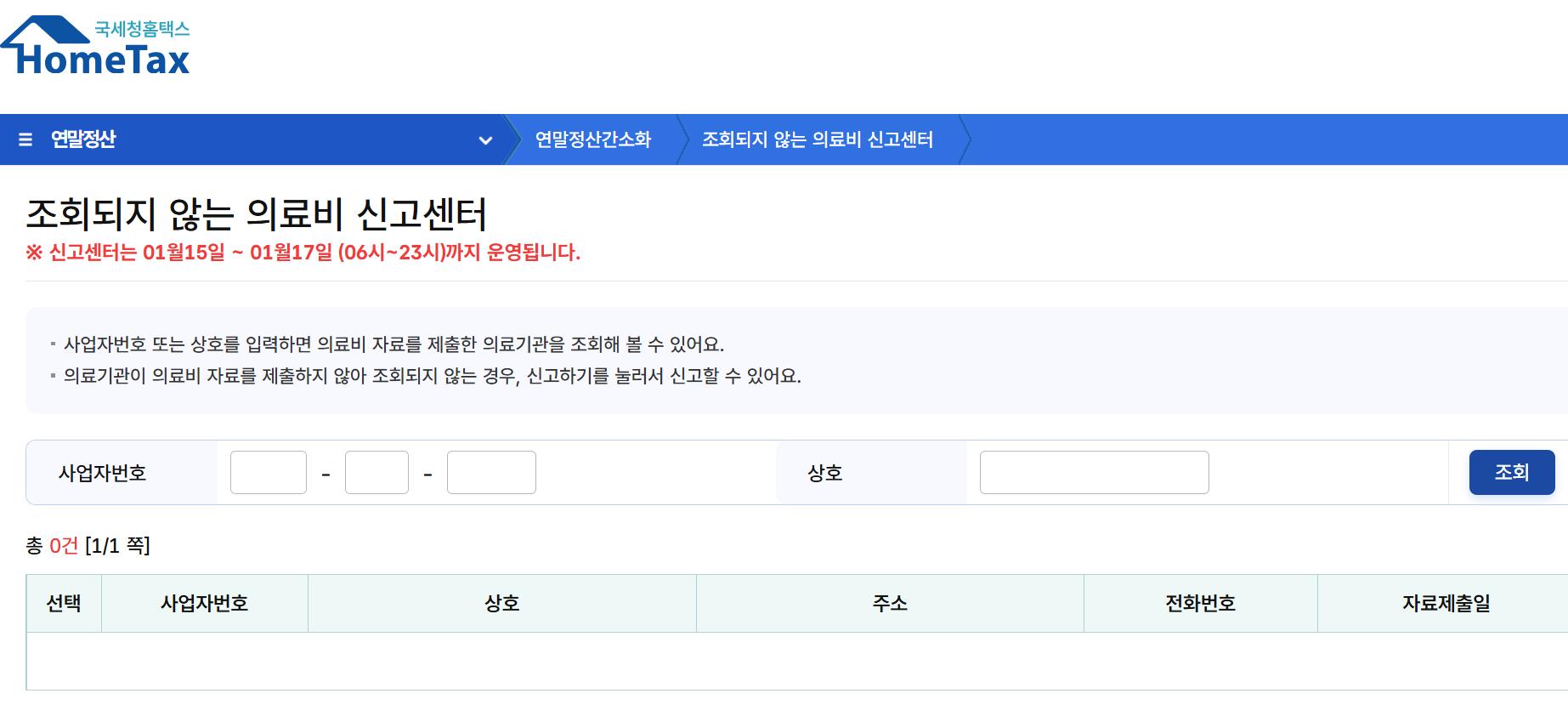 - 조치: 홈택스 내 [조회되지 않는 의료비 신고센터] 메뉴를 이용해 신고하거나, 해당 병·의원에서 영수증을 직접 발급받으시기 바랍니다. (신고센터 운영 기간: 1.15. ~ 1.17.)